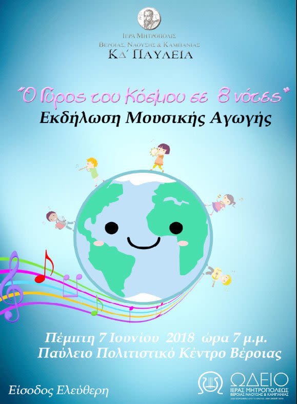 Το Ωδείο της Ιεράς Μητροπόλεως Βεροίας, Ναούσης & Καμπανίας, στα πλαίσια των ΚΔ’ ΠΑΥΛΕΙΩΝ, διοργανώνει ετήσια εκδήλωση του τμήματος Μουσικής Αγωγής με τίτλο «Ο Γύρος του κόσμου σε 8 νότες», που θα πραγματοποιηθεί την Πέμπτη 7 Ιουνίου 2018, και ώρα 7 μ. μ., στο Παύλειο Πολιτιστικό Κέντρο Βέροιας.