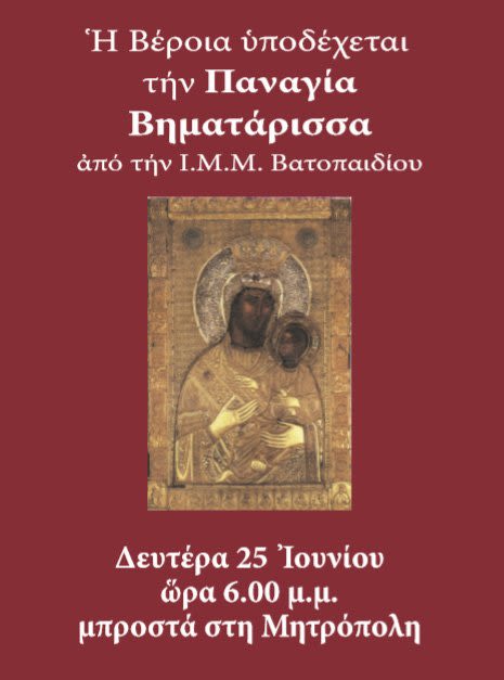 Τη Δευτέρα 25 Ιουνίου στις 6:00 μ.μ. μπροστά στον Ιερό Μητροπολιτικό Ναό Βεροίας θα γίνει υποδοχή αντιγράφου της Θαυματουργής Εικόνος της Παναγίας της Βημματαρίσσης από την Ιερά Μεγίστη Μονή Βατοπαιδίου Αγίου Όρους.