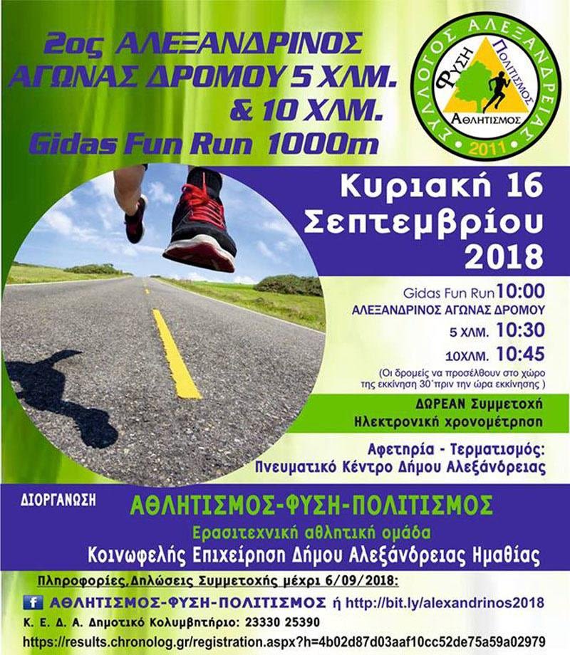 Η Κοινωφελής Επιχείρηση του Δήμου Αλεξάνδρειας και η ερασιτεχνική αθλητική ομάδα Αθλητισμός – Φύση – Πολιτισμός, διοργανώνουν τον 2ο Αλεξανδρινό αγώνα 5 χλμ. & 10χλμ. και τον παιδικό αγώνα Gidas Fun Run 1000μ.