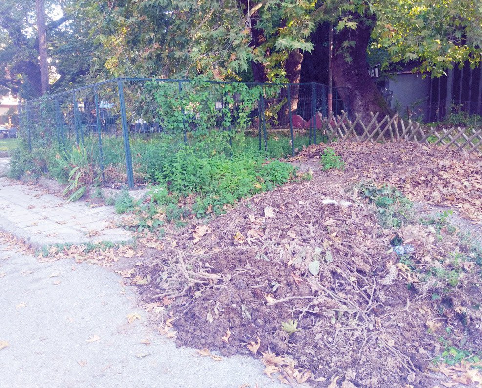 Σύμφωνα με πληροφορίες από τη γειτονιά, οι όγκοι με τα φύλλα και τα χώματα ανασύρθηκαν από τον καθαρισμό του πάρκου και εδώ και τέσσερις μέρες παραμένουν εκεί.