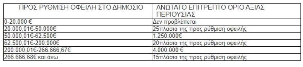 Επομένως, το Δημόσιο δεν προτείνει ρυθμίσεις, εφόσον η συνολική αξία της περιουσίας του οφειλέτη και τυχόν συνοφειλέτη/συνοφειλετών που υπέβαλαν την αίτηση από κοινού με τον οφειλέτη, υπερβαίνει τα πιο κάτω ποσά (στήλη 2) ανά ύψος προς ρύθμιση οφειλής προς το Δημόσιο (στήλη 1).