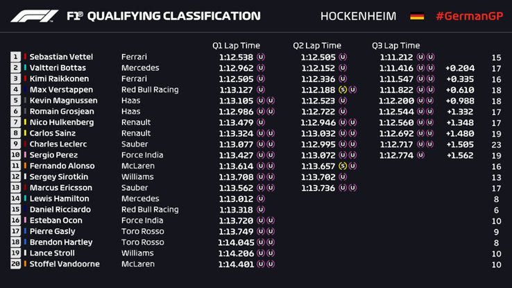 Ο Γερμανός μπήκε στο Q3 δίχως να έχει τον ταχύτερο χρόνο σε οποιαδήποτε άλλη περίοδο μέσα στο τριήμερο, όμως τη στιγμή που έπρεπε πάτησε τέρμα το γκάζι, ήταν ταχύτερος όλων και πανηγύρισε ακόμα μια pole position στη φετινή χρονιά. Ο χρόνος που του έδωσε την pole ήταν στο 1:11.212 και αποτελεί φυσικά το νέο απόλυτο ρεκόρ πίστας στο Hockenheim. Στην 2η θέση ολοκλήρωσε ο Valtteri Bottas με την Mercedes W09, με τον Φινλανδό να κάνει ότι μπορεί αλλά έμεινε 0.2s πίσω από τον Vettel και αύριο η μάχη αναμένεται μεγάλη. Στην 3η θέση ολοκλήρωσε ο Kimi Raikkonen με την δεύτερη SF71-H, όμως έδειξε πως δεν είχε την ταχύτητα του teammate του.
