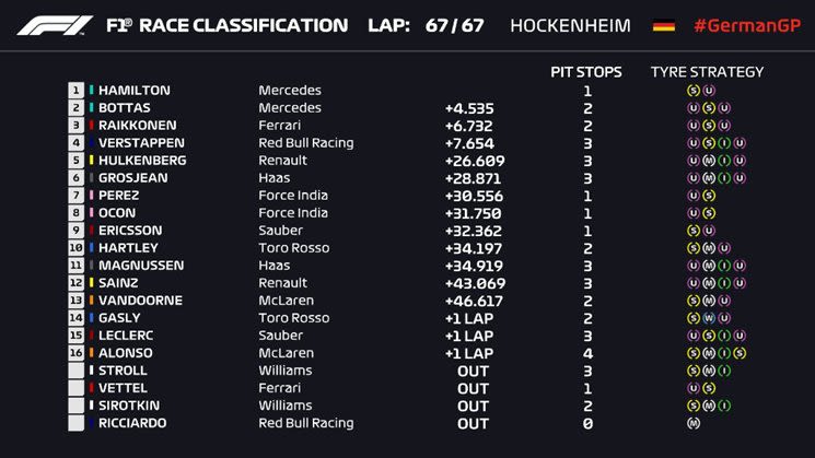 Ο Βρετανός ξεκίνησε από την 14η θέση τον αγώνα με διαφορετική στρατηγική από όλους, κράτησε τα ελαστικά του, πίεσε όσο ήταν δυνατό και όταν πέρασε αναπάντεχα στην 1η θέση, έδωσε τα πάντα με συνεχόμενους ταχύτερους γύρους, κράτησε πίσω τους αντιπάλους του που είχαν πιο φρέσκα ελαστικά και πήρε μια τεράστια νίκη, νούμερο 66 στη καριέρα του που τον έφερε και πάλι στη κορυφή της βαθμολογίας. Εκπληκτική εμφάνιση από τον Hamilton σήμερα, καθώς πίεσε αλλά κρατούσε τα ελαστικά του στην κατάλληλη θερμοκρασία και πλέον οδηγεί και πάλι το πρωτάθλημα. Μετά το Pit-stop του ήταν ταχύτερος όλων, δεν έκανε λάθη όταν ήρθε η βροχή και αυτό ήταν που του έδωσαν 25 βαθμούς Στην 2η θέση τερμάτισε ο Valtteri Bottas, ο οποίος έκανε το 1-2 για την Mercedes, όμως είχε μόλις μία προσπάθεια μετά το SC να περάσει στην 1η θέση, δεν τα κατάφερε και η ομάδα του είπε να μείνει 2ος, σε ένα πολύ καλό αποτέλεσμα για τον ίδιο. Στην 3η θέση ολοκλήρωσε ο Kimi Raikkonen με την μοναδική Ferrari που τερμάτισε τον αγώνα και παρά τα φρέσκα ελαστικά, δεν μπόρεσε να πάρει τη νίκη, σε έναν αγώνα όπου δέχθηκε και εκείνος εντολές από την ομάδα.