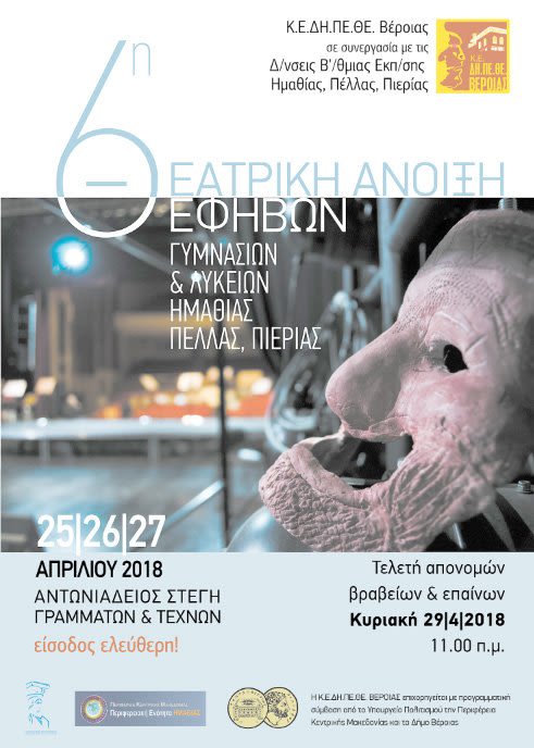 Το Δημοτικό Περιφερειακό Θέατρο Βέροιας σε συνεργασία με τις Διευθύνσεις Δευτεροβάθμιας Εκπαίδευσης Ημαθίας, Πιερίας, Πέλλας & και υπό την αιγίδα του Υπουργείου Παιδείας διοργανώνουν την 6η Θεατρική Άνοιξη Εφήβων Γυμνασίων & Λυκείων Ημαθίας, Πιερίας και Πέλλας από την Τετάρτη 26 έως και την Παρασκευή 28 Απριλίου 2018 στην Αντωνιάδειο Στέγη Γραμμάτων & Τεχνών στη Βέροια.