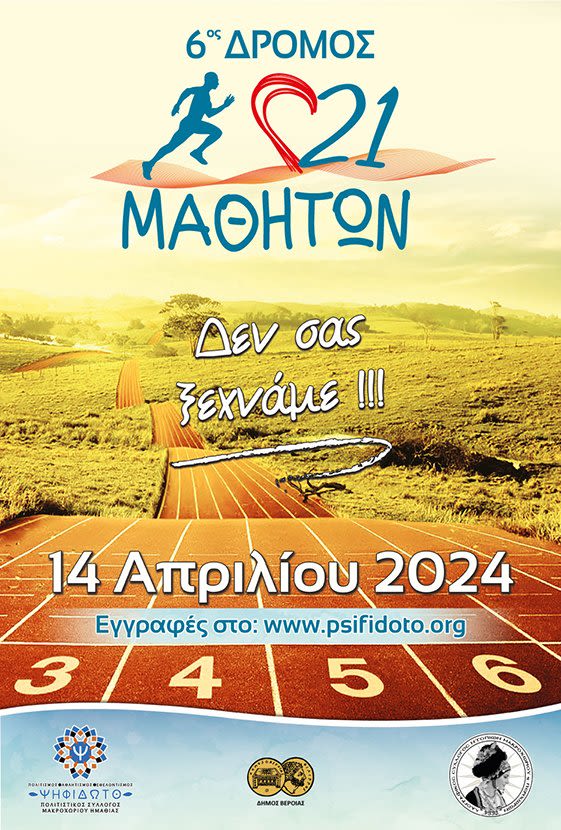 Ο ΠΟΛΙΤΙΣΤΙΚΟΣ ΣΥΛΛΟΓΟΣ ΜΑΚΡΟΧΩΡΙΟΥ «ΨΗΦΙΔΩΤΟ», συνδιοργανώνει με τον Δήμο Βέροιας, τον 6ο ΑΓΩΝΑ ΔΡΟΜΟΥ 21 Μαθητών την Κυριακή 14 ΑΠΡΙΛΙΟΥ 2024, από τις 11:00 έως τις 14:00 και οι αθλητές θα κινούνται εντός των Οικισμών Μακροχωρίου, Διαβατού και Μέσης.
