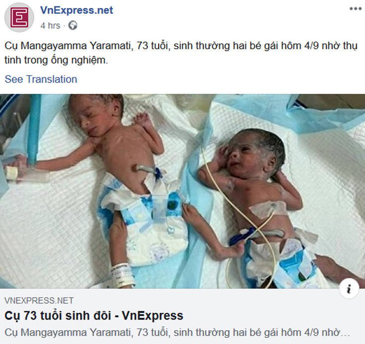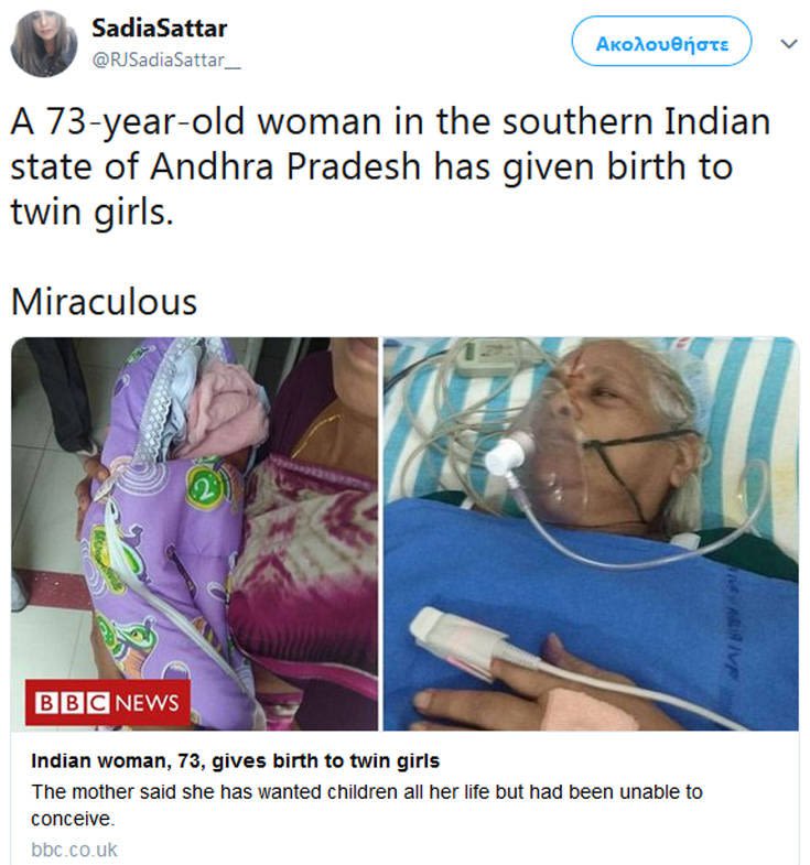 Ένα απίστευτο περιστατικό σημειώθηκε στην επαρχία της νότιας Ινδίας Andhra Pradesh, με μία 73χρονη γυναίκα να φέρνει στον κόσμο δίδυμα κοριτσάκια.