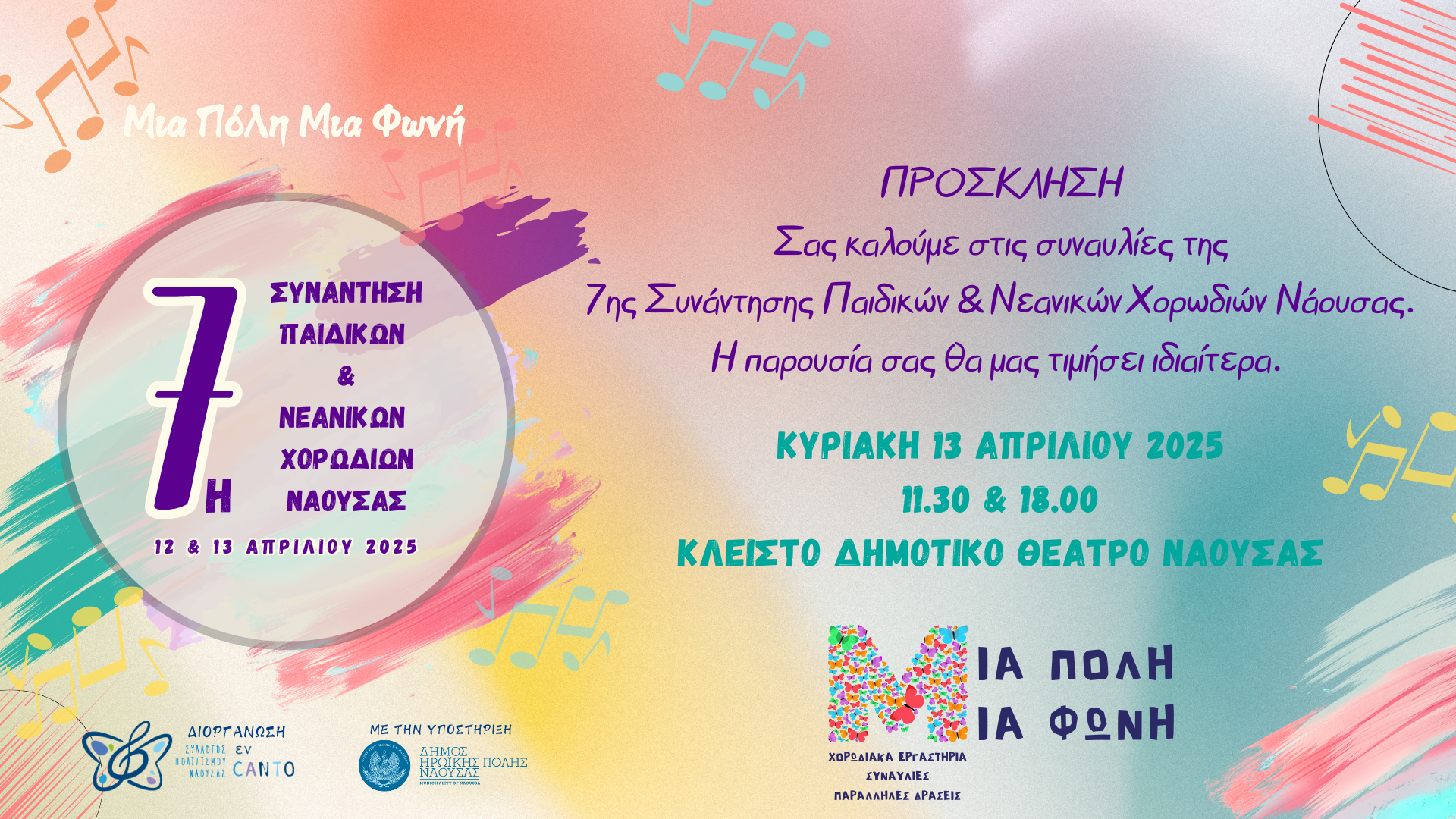 Πολιτισμού Νάουσας ενCANTO γνωστοποιεί το πρόγραμμα της διοργάνωσης της 7ης Συνάντησης Παιδικών & Νεανικών Χορωδιών Νάουσας Μια πόλη Μια φωνή, και προσκαλεί τον κόσμο στις συναυλίες και τις