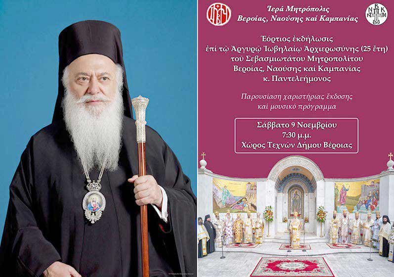 Η Ιερά Μητρόπολη Βεροίας, Ναουσης και Καμπανίας εορτάζει το Αργυρό Ιωβηλαίο Αρχιεροσύνης του ποιμενάρχου της Σεβασμιωτάτου Μητροπολίτου Βεροίας, Ναουσης και Καμπανίας κ. Παντελεήμονος και σας προσκαλεί να τιμήσετε με την παρουσία σας τις εκδηλώσεις για τα 25 χρόνια αρχιερατείας του Μητροπολίτου.
