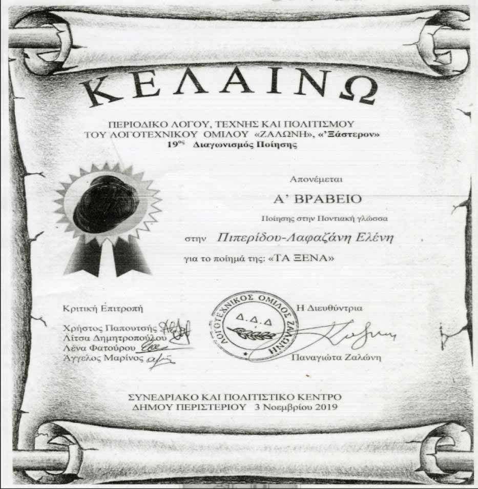 Το Α΄ βραβείο ποίησης στην ποντιακή γλώσσα, έλαβε η συμπολίτισσά μας, δασκάλα Ελένη Πιπερίδου-Λαφαζάνη, για το ποίημά της «Τα ξένα», από το περιοδικό λόγου, τέχνης και πολιτισμού, του Λογοτεχνικού Ομίλου «Ζαλώνη». Η συγγραφέας συμμετείχε με το ποίημα στον 19ο Διαγωνισμό ποίησης του περιοδικού «ΚΕΛΑΙΝΩ» και όπως αναφέρει σε επιστολή της στο Λαό, η κα Ευτυχία Σοφιανίδου (Δ/ντρια του ΕΦΚΑ Βέροιας), που υπήρξε μαθήτρια της κας Πιπερίδου-Λαφαζάνη: «Διαβάζοντας το ποίημα-ύμνο στον ποντιακό ελληνισμό της αγαπημένης μας δασκάλας, δεν έχουμε παρά να εκτιμήσουμε την προσφορά της στην ανάδειξη της παράδοσης μέσα από τον σκληρό αγώνα για επιβίωση των Ελλήνων του Πόντου. Το μήνυμα της σήμερα πιο πολύ παρά ποτέ άλλοτε επίκαιρο».