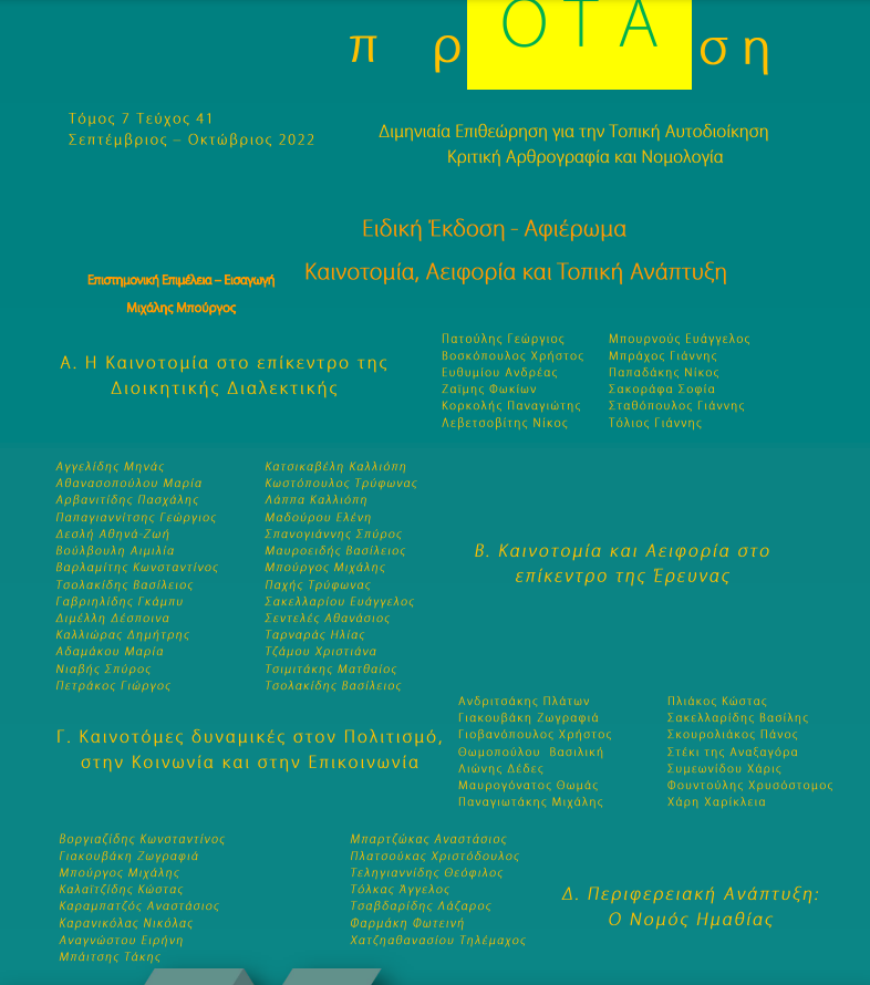 Το νέο τεύχος του περιοδικού αποτελεί μια ειδική έκδοση με τίτλο: “Καινοτομία, Αειφορία και Τοπική Ανάπτυξη”, η οποία φιλοδοξεί να αναδείξει τον πολύπλευρο προβληματισμό που αναπτύσσεται γύρω από την έννοια της καινοτομίας.
