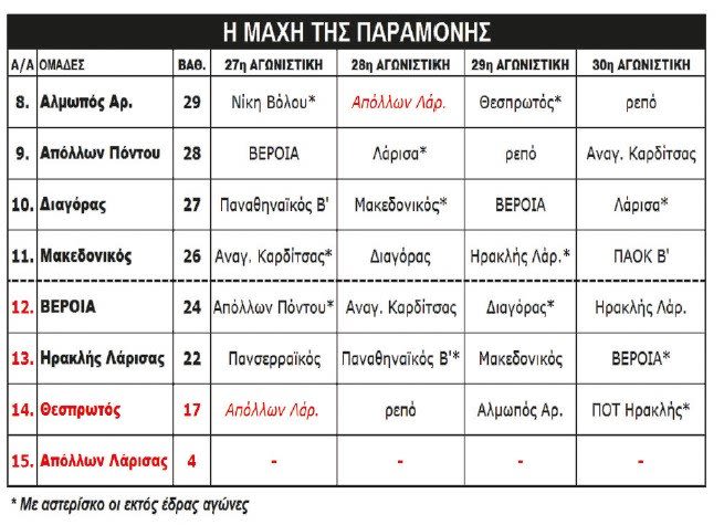 Από εκεί και πέρα, Αλμωπός Αριδαίας (29β.) και Μακεδονικός (26β.) έχουν δύσκολες εξόδους κόντρα σε Νίκη Βόλου και Αναγέννηση Καρδίτσας αντίστοιχα, ενώ ο Ηρακλής Λάρισας υποδέχεται τον πρωτοπόρο Πανσερραϊκό και ο Διαγόρας τον Παναθηναϊκό Β’.