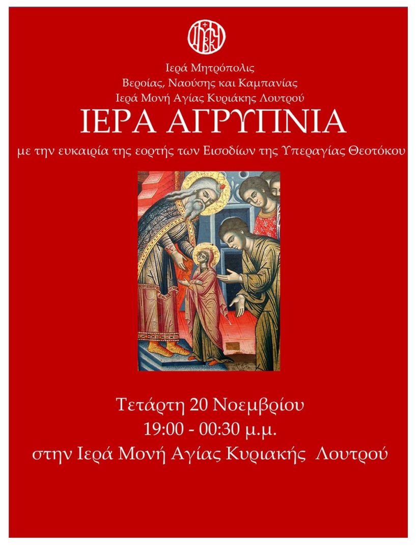 Από την Ιερά Μονή της Αγίας Κυριακής Λουτρού ανακοινώνεται ότι την Τετάρτη 20 Νοεμβρίου, από τις 7:00 μ.μ. έως τις 12:30 μ.μ., θα τελεστεί Πανηγυρική Ιερά Αγρυπνία με την ευκαιρία της θεομητορικής εορτής των Εισοδίων της Υπεραγίας Θεοτόκου.