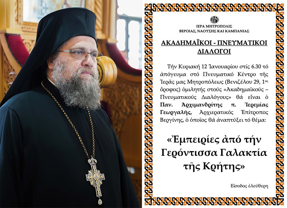 Τήν Κυριακή 12 Ἰανουαρίου στίς 6.30 τό ἀπόγευμα στό Πνευματικό Κέντρο τῆς Ἱερᾶς μας Μητροπόλεως (Βενιζέλου 29, 1ος ὄροφος) ὁμιλητής στούς «Ἀκαδημαϊκούς – Πνευματικούς Διαλόγους» θά εἶναι ὁ Παν. Ἀρχιμανδρίτης π. Ἱερεμίας Γεωργαλῆς, Ἀρχιερατικός Ἐπίτροπος Βεργίνης, ὁ ὁποῖος θά ἀναπτύξει τό θέμα: «Ἐμπειρίες ἀπό τήν Γερόντισσα Γαλακτία τῆς Κρήτης».
