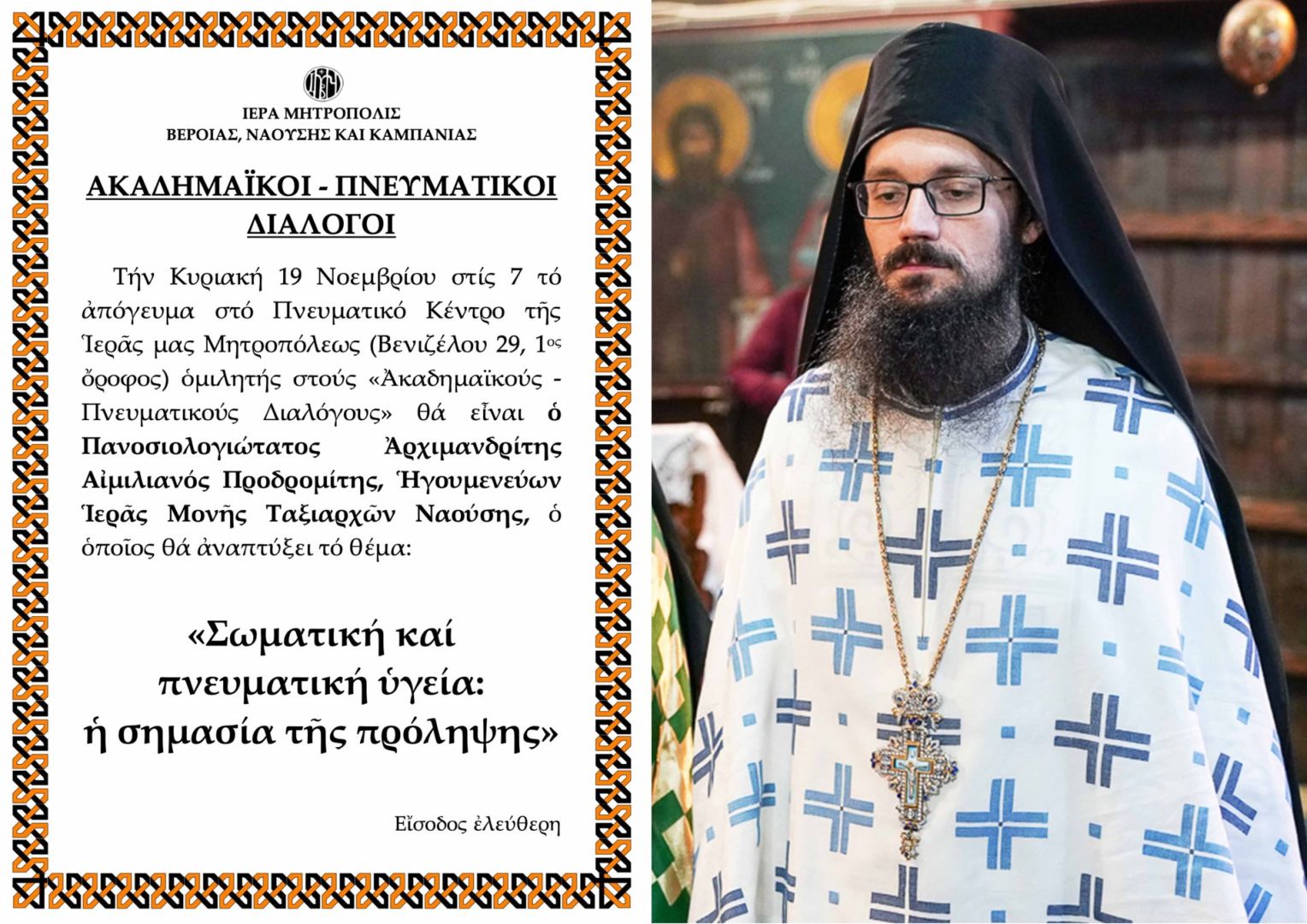 Τήν Κυριακή 19 Νοεμβρίου στίς 7 τό ἀπόγευμα στό Πνευματικό Κέντρο τῆς Ἱερᾶς μας Μητροπόλεως (Βενιζέλου 29, 1ος ὄροφος) ὁμιλητής στούς «Ἀκαδημαϊκούς – Πνευματικούς Διαλόγους» θά εἶναι ὁ Πανοσιολογιώτατος Ἀρχιμανδρίτης Αἰμιλιανός Προδρομίτης, Ἡγουμενεύων Ἱερᾶς Μονῆς Ταξιαρχῶν Ναούσης, ὁ ὁποῖος θά ἀναπτύξει τό θέμα: «Σωματική καί πνευματική ὑγεία: ἡ σημασία τῆς πρόληψης».