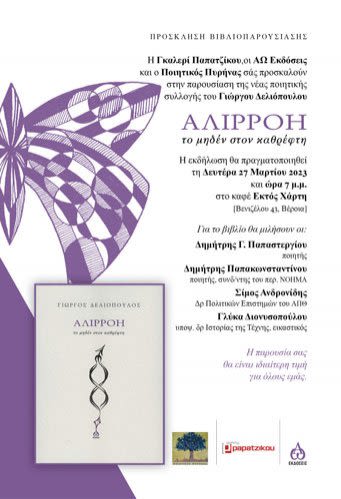 Η ΓΚΑΛΕΡΙ ΠΑΠΑΤΖΙΚΟΥ, οι εκδόσεις ΑΩ και ο Ποιητικός Πυρήνας σάς προσκαλούν στην παρουσίαση της νέας ποιητικής συλλογής του Γιώργου Δελιόπουλου, “Αλιρρόη”