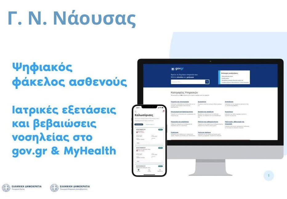 Έχοντας ολοκληρώσει τον Ψηφιακό Φάκελο Ασθενούς από 1-1-2023 οι πολίτες του Δήμου Νάουσας και της ευρύτερης περιοχής έχουν πρόσβαση για πρώτη φορά από το κινητό τους τηλέφωνο μέσω της εφαρμογής του gov.gr στο MyHealth app , μέσω κωδικών taxisnet, στον ψηφιακό ιατρικό τους φάκελο. Έτσι μέσω της εφαρμογής , οι πολίτες μπορούν πλέον να εκδίδουν ψηφιακά και να έχουν πρόσβαση στα εξής: