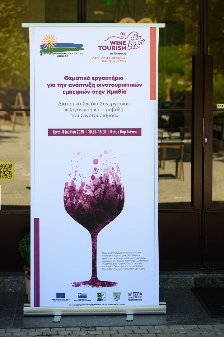 Με επιτυχία πραγματοποιήθηκε την Τετάρτη 8 Ιουλίου 2025 το Θεματικό Εργαστήριο για την ανάπτυξη οινοτουριστικών εμπειριών στην Ημαθία στο πλαίσιο υλοποίησης του Προγράμματος Συνεργασίας ”Οργάνωση και Προβολή του Οινοτουρισμού” που είναι ενταγμένο στο Τοπικό Πρόγραμμα LEADER/CLLD της Αναπτυξιακής Ημαθίας.