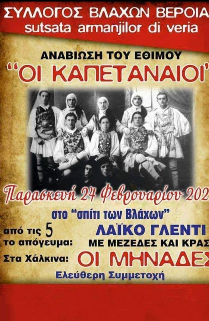 Λαϊκό γλέντι με μεζέδες, κρασί και χάλκινα διοργανώνει ο Σύλλογος Βλάχων Βέροιας , την Παρασκευή 24 Φεβρουαρίου 2023, στις 5:00 μ.μ. Επίσης θα αναβιώσει και το έθιμο των “Καπεταναίων”.