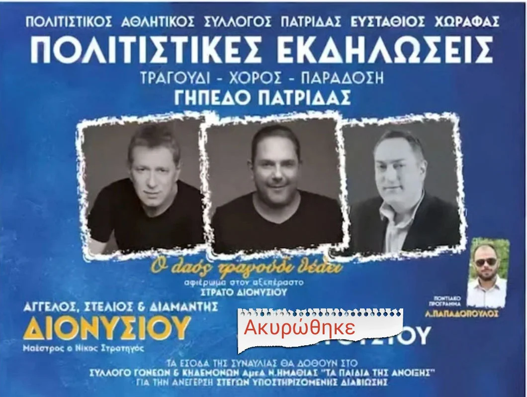 Δεν πραγματοποιήθηκε τελικά λόγω των καιρικών συνθηκών, το βράδυ του Σαββάτου 30 Αυγούστου, η συναυλία των αδελφών Άγγελου, Στέλιου και Διαμαντή Διονυσίου, που διοργάνωσε ο Πολιτιστικός Αθλητικός Σύλλογος Πατρίδας «Ευστάθιος Χωραφάς», στο πλαίσιο των καλοκαιρινών του εκδηλώσεων. Η βραδιά ήταν αφιερωμένη στο ΚΔΗΦ «Τα παιδιά της Άνοιξης», για την ενίσχυσή τους και ενώ όλα ήταν έτοιμα και η προσέλευση του κόσμου συνεχιζόταν με ρυθμό, η βροχή ανέβαλε την εκδήλωση, η οποία ωστόσο παραμένει πιστή στον κοινωνικό σκοπό της.