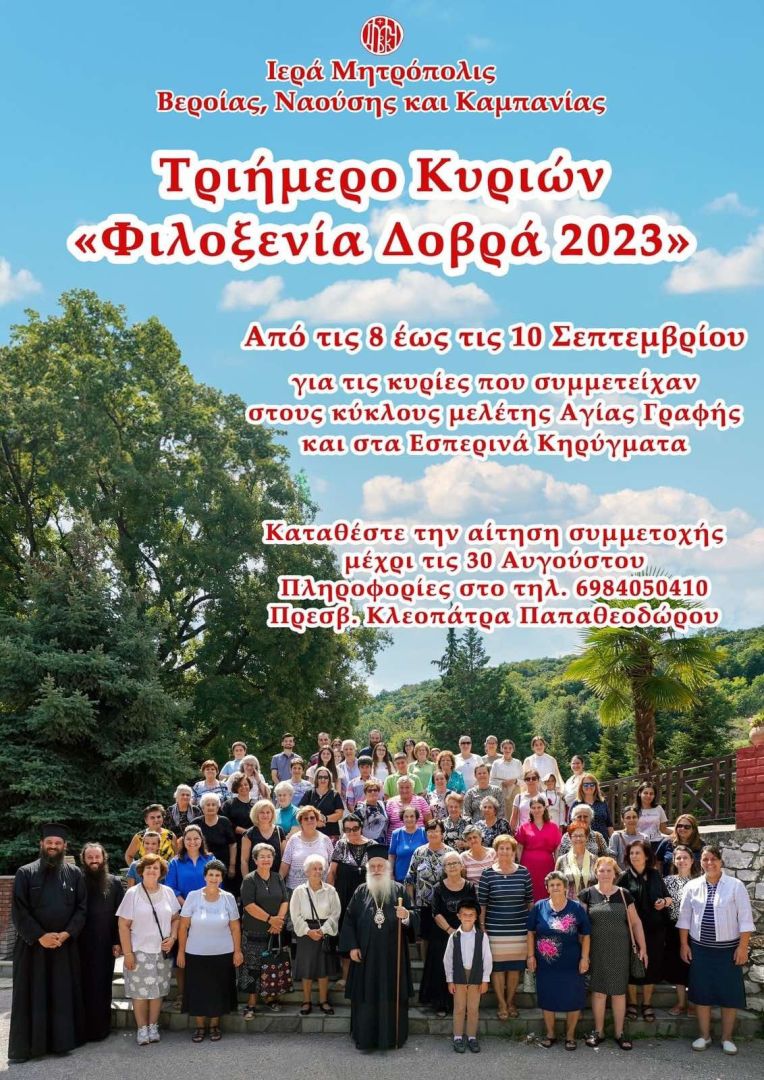Η Ιερά Μητρόπολις Βεροίας, Ναούσης και Καμπανίας θα πραγματοποιήσει στο πλαίσιο του προγράμματος «Φιλοξενία Δοβρά 2013» το καθιερωμένο τριήμερο κυριών, για τις κυρίες που συμμετείχαν στους Κύκλους Μελέτης Αγίας Γραφής και στα Εσπερινά Κηρύγματα των ενοριών της Μητροπόλεως μας.