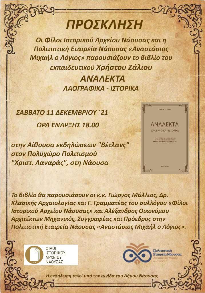 φίλοι Ιστορικού Αρχείου Νάουσας και η Πολιτιστική Εταιρεία Νάουσας «Αναστάσιος Μιχαήλ ο Λόγιος», παρουσιάζουν το βιβλίο του Χρήστου