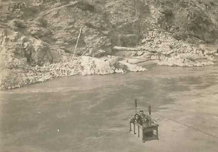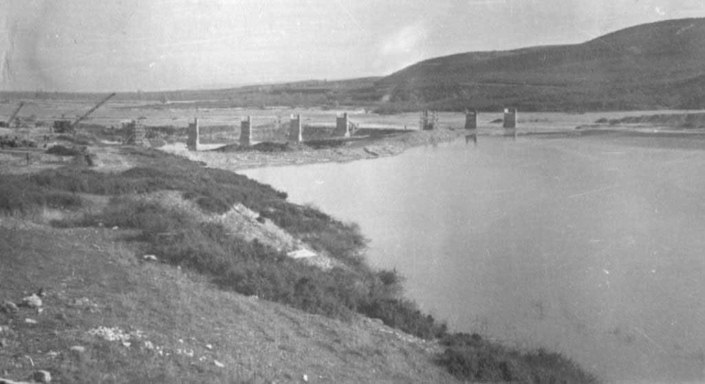 Οι προκαταρκτικές εργασίες υποστύλωσης για την κατασκευή της γέφυρας. Παρατηρήστε το βοηθητικό εναέριο βαγόνι!!! (Συλλογή Θεοδωρίδη Αδάμ)