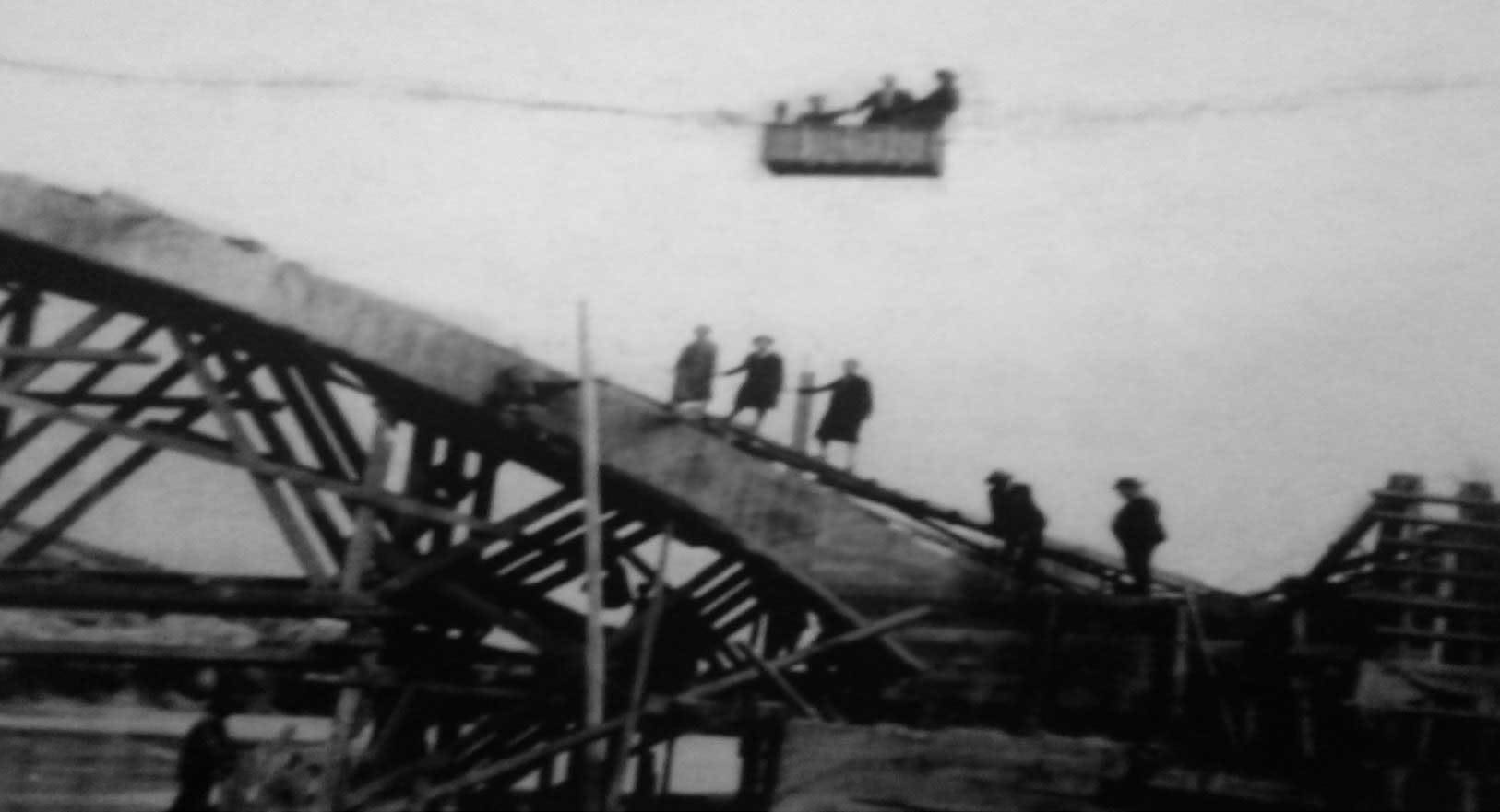 Το εναέριο βαγόνι παραπλεύρως της γέφυρας που βοήθησε και στην ανοικοδόμησή της.