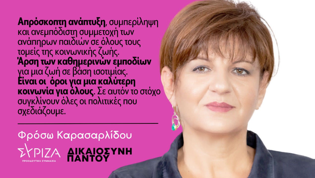 Η απρόσκοπτη ανάπτυξη, συμπερίληψη και ανεμπόδιστη συμμετοχή των ανάπηρων παιδιών σε όλους τους τομείς της κοινωνικής ζωής και η άρση των καθημερινών εμποδίων για μια ζωή σε βάση ισοτιμίας δημιουργεί τους όρους μιας καλύτερης κοινωνίας για όλους. Σε αυτόν το στόχο συγκλίνουν όλες οι πολιτικές που σχεδιάζουμε.