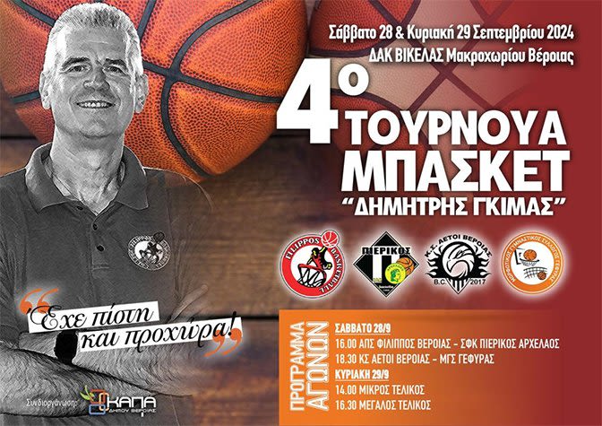 Το Σαββατοκύριακο 28-29 Σεπτεμβρίου θα διεξαχθεί το 4ο Τουρνουά Μπάσκετ “Δημήτρης Γκίμας” σε συνδιοργάνωση με το ΚΑΠΑ Δήμου Βέροιας.