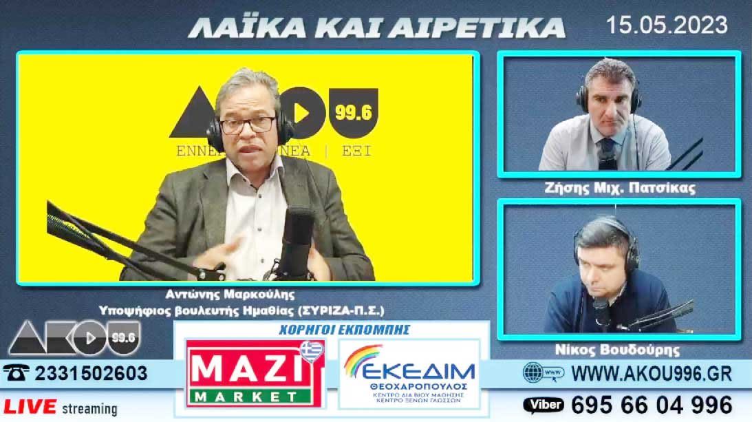 Το μεσημέρι της Δευτέρας(15/5) ο υποψήφιος βουλευτής Ημαθίας του ΣΥΡΙΖΑ-Π.Σ. Αντώνης Μαρκούλης, μίλησε ζωντανά με τους Ζήση Μιχ. Πατσίκα και Νίκο Βουδούρη στην εκπομπή Λαϊκά&Αιρετικά του ΑΚΟΥ 99,6. Ο υποψήφιος βουλευτής μίλησε εκτενώς για τις παρεμβάσεις που πρέπει να γίνουν άμεσα την επομένη των εκλογών, για τις οποίες έχει δεσμευθεί ο ΣΥΡΙΖΑ και αφορούν το «πάγωμα» των πλειστηριασμών μέχρι να ψηφιστεί νόμος για την προστασία της πρώτης κατοικίας και σημαντικό «κούρεμα» των δανείων που πνίγουν τα νοικοκυριά. Ο κ. Μαρκούλης μίλησε εκτενώς για την ανάγκη στήριξης των αγροτών και την άμεση ανάγκη για τροποποίηση του κανονισμού του ΕΛΓΑ που επιτέλους θα πρέπει να καλύπτει όλες τις καταστροφές από καιρικά αίτια. Δεν παρέλειψε να καυτηριάσει την απαράδεκτη, όπως ανέφερε, κατάσταση με το Εργοστάσιο Ζάχαρης στο Πλατύ, που ενώ έπρεπε ήδη να λειτουργεί, αυτό έχει απογυμνωθεί ακόμη και από τον εξοπλισμό του και είναι ένα «κουφάρι»!