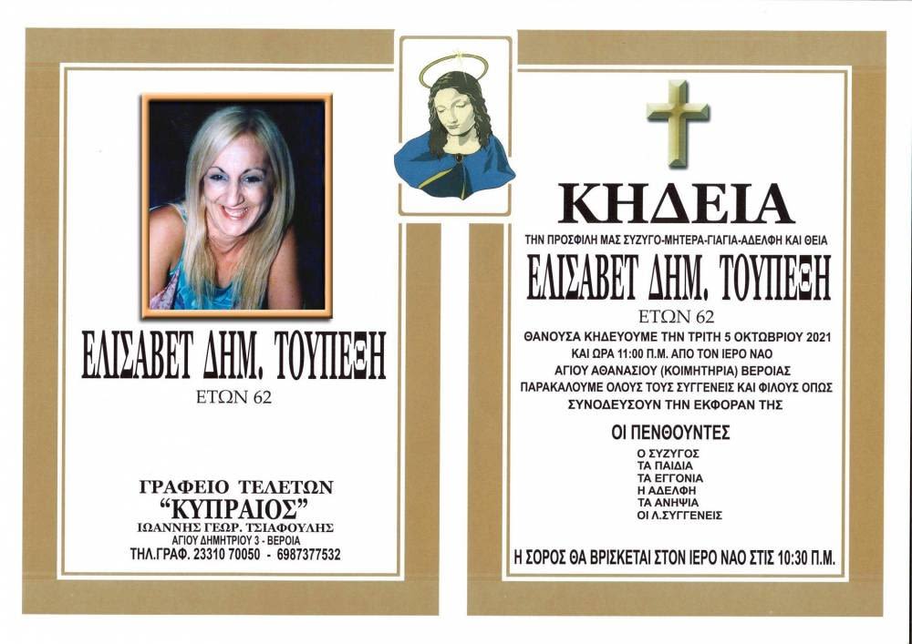 Απεβίωσε σε ηλικία 62 ετών η Ελισάβετ Δημ. Τουπεξή. Η κηδεία θα γίνει την Τρίτη 5 Οκτωβρίου, στις 11πμ, στον Ιερό Ναό Αγίου Αθανασίου (κοιμητήρια) Βέροιας.