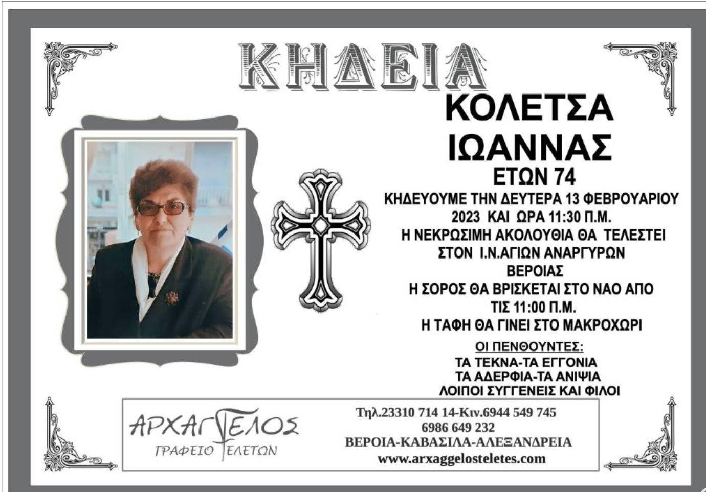 Απεβίωσε σε ηλικία 74 ετών η Ιωάννα Κολέτσα. Η κηδεία της θα γίνει την Δευτέρα 13 Φεβρουαρίου, στις 11.30πμ, στον Ιερό Ναό Αγίων Αναργύρων, στην Βέροια.