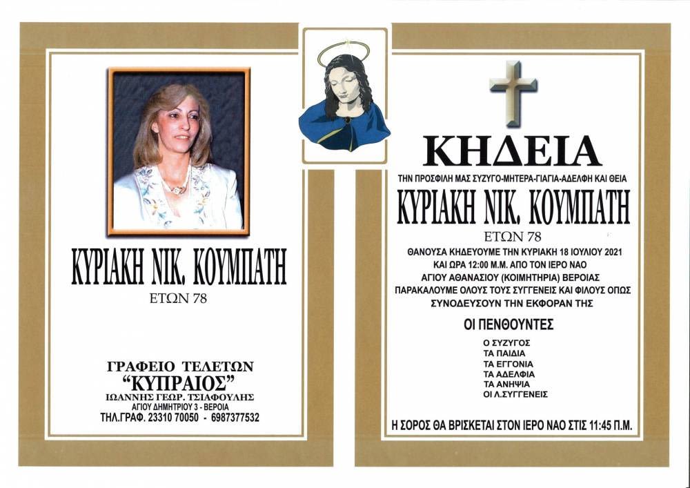 Απεβίωσε σε ηλικία 78 ετών η Κυριακή Νικ. Κουμπατή. Η κηδεία της θα γίνει την Κυριακή 18 Ιουλίου, στις 12μ, στον Ιερό Ναό Αγίου Αθανασίου (κοιμητήρια) Βέροιας.