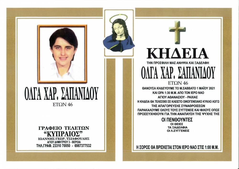 Απεβίωσε σε ηλικία 46 ετών η Όλγα Χαρ. Σαπανίδου. Η κηδεία θα γίνει το Μ. Σάββατο, στον Ιερό Ναό Αγίου Αθανασίου Ραχιάς και σε κλειστό οικογενειακό κύκλο λόγω της απαγόρευσης των συναθροίσεων.