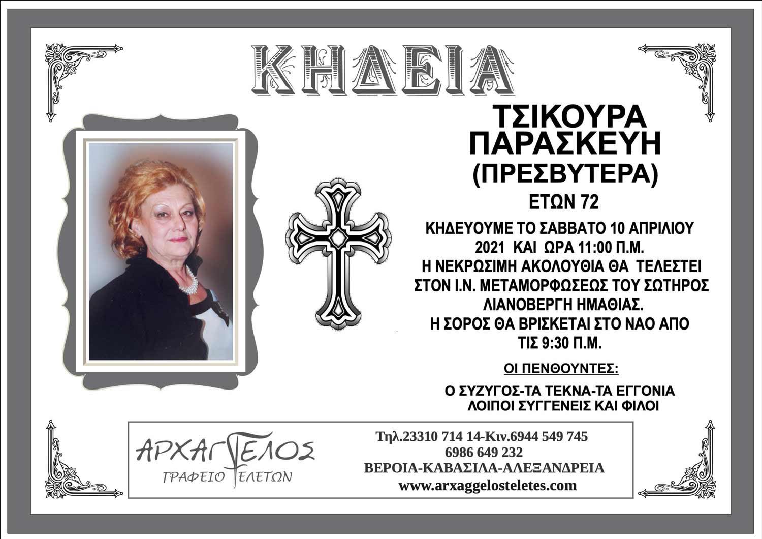 Απεβίωσε σε ηλικία 72 ετών η Παρασκευή Τσικούρα (Πρεσβυτέρα). Η κηδεία θα γίνει το Σάββατο 10 Απριλίου 2021 στις 11:00 π.μ. στον Ιερό Ναό Μεταμορφώσεως του Σωτήρος, στο Λιανοβέργι Ημαθίας.