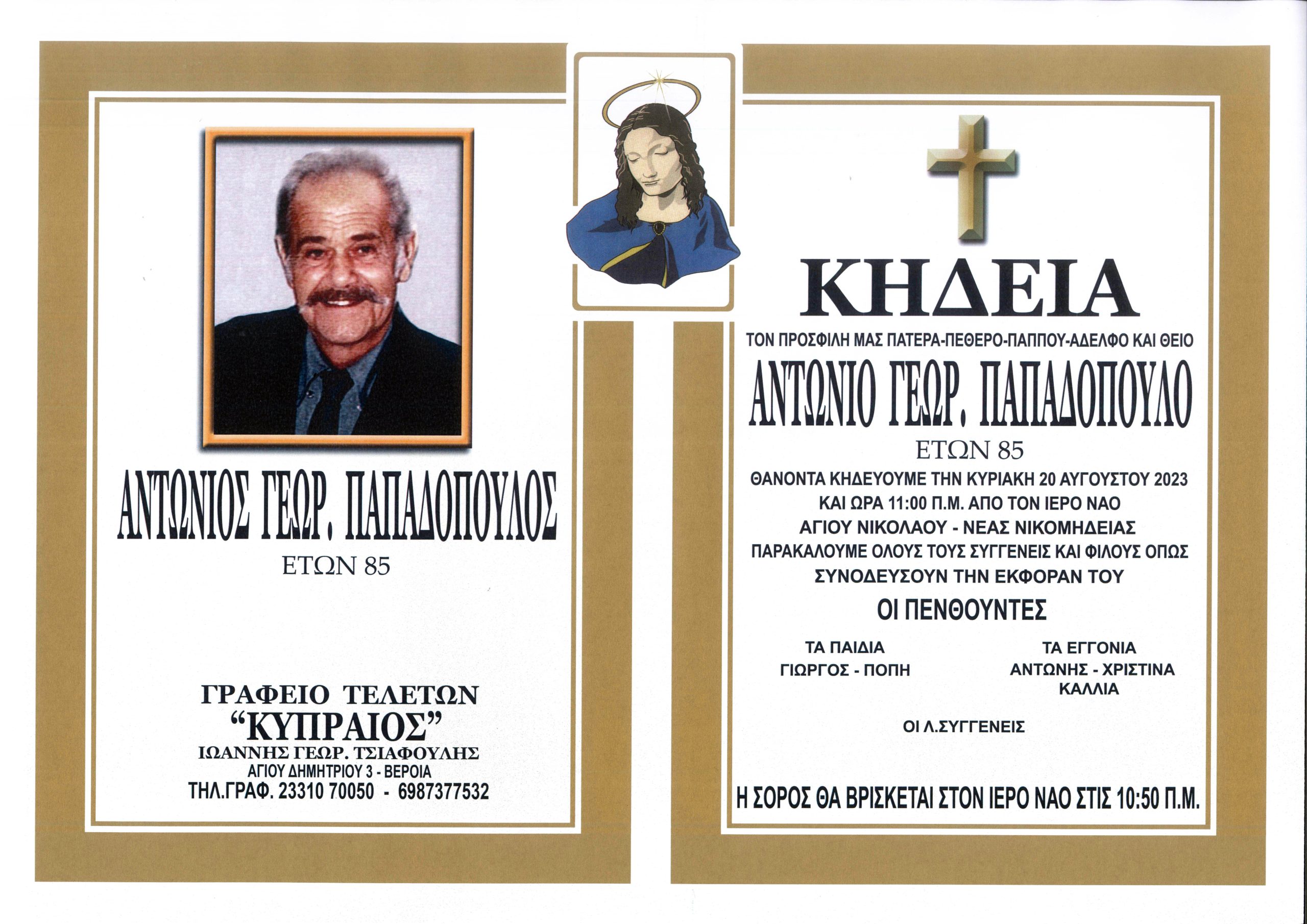 Κηδεύτηκε σήμερα 20 Αυγούστου στον Ι.Ν. Αγίου Νικολάου Νέας Νικομήδειας ο Αντώνιος Γεωρ. Παπαδόπουλος σε ηλικία 85 ετών