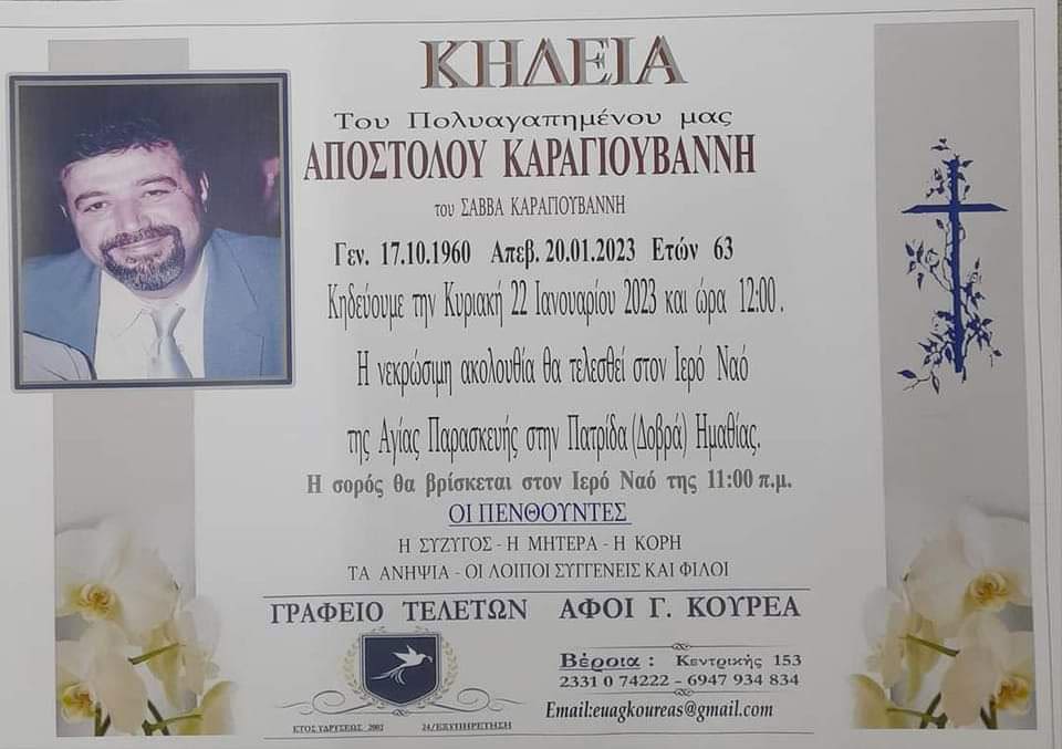 Απεβίωσε ο Απόστολος Καραγιουβάνης σε ηλικία 63 ετών. Η κηδεία θα γίνει την Κυριακή 22 Ιανουαρίου 2023 στις 12:00. Η νεκρώσιμη ακουλουθία θα τελεστεί στον Ιερό Ναό Αγίας Παρασκευής στην Πατρίδα Ημαθίας.