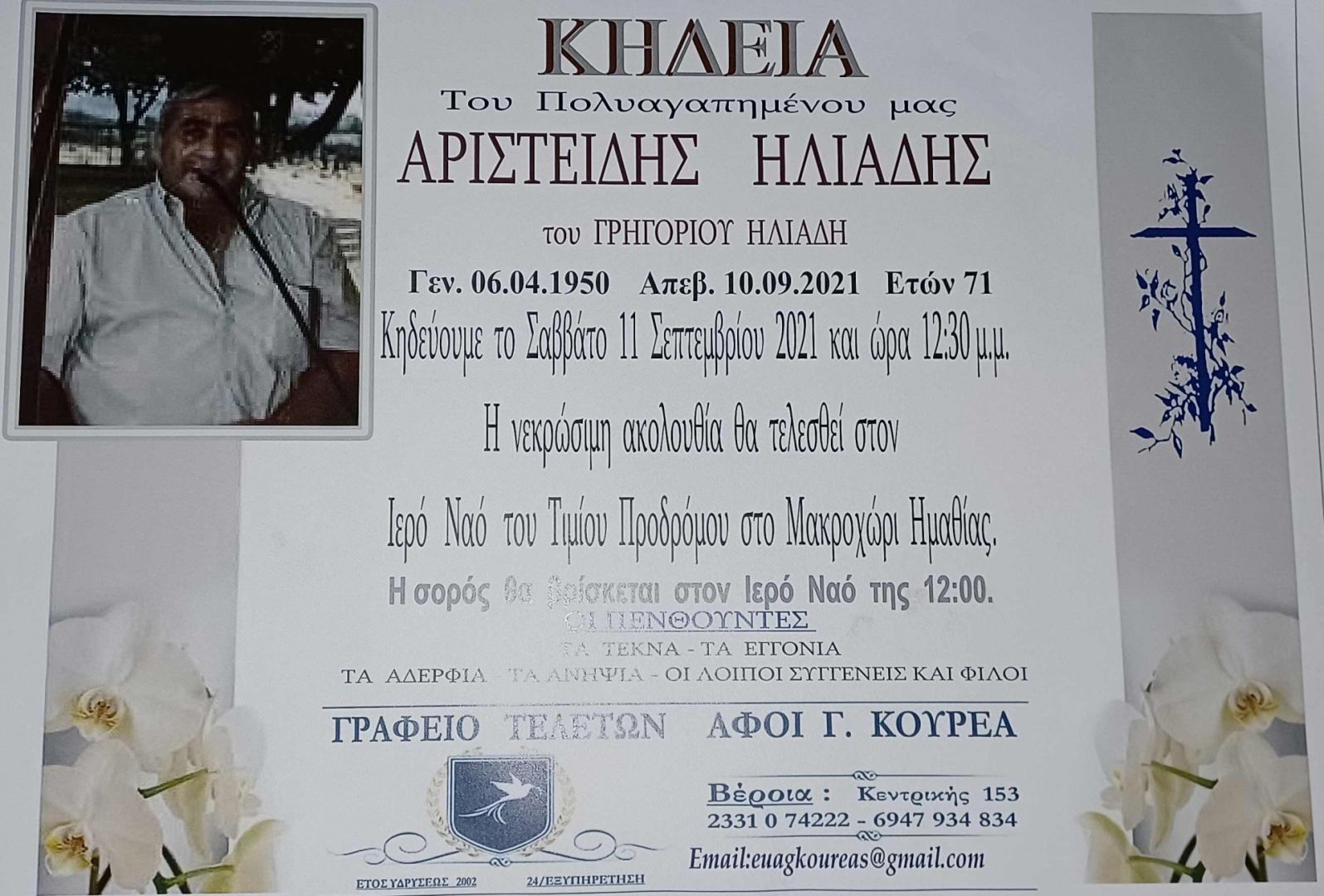 Απεβίωσε σε ηλικία 71 ετών ο Αριστείδης Ηλιάδης.  Η νεκρώσιμη ακολουθία θα τελεστεί το Σάββατο 11 Σεπτεμβρίου 2021στις 12:30 μ.μ. στον Ιερό Ναό Τιμίου Προδρόμου Μακροχωρίου.