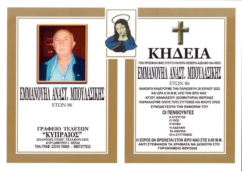 Απεβίωσε ο Εμμανουήλ Μπουλασίκης σε ηλικία 86 ετών. Η κηδεία θα γίνει την Παρασκευή 29 Ιουλίου 2022 στις 6:30 μ.μ., στον Ιερό Ναό Αγίου Αθανασίου (Κοιμητήρια) Βέροιας.