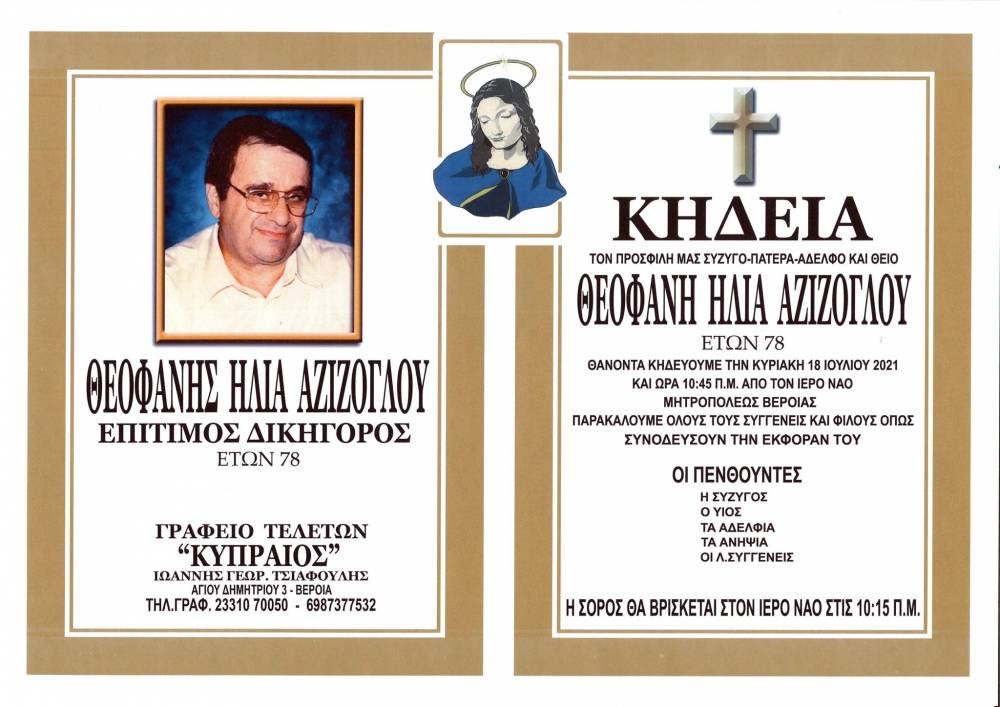 Απεβίωσε σε ηλικία 78 ετών ο επίτιμος δικηγόρος Θεοφάνης Ηλία Αζίζογλου. Η κηδεία του θα γίνει την Κυριακή 18 Ιουλίου στις 10.45πμ, στον Ιερό Ναό Μητροπόλεως, στην Βέροια.