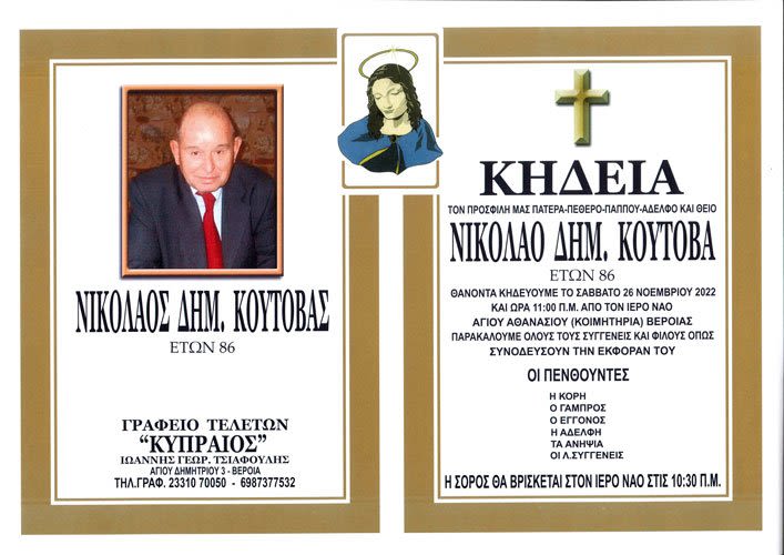 Απεβίωσε ο Νικόλαος Δημ. Κουτόβας σε ηλικία 86 ετών. Η κηδεία θα γίνει το Σάββατο 26 Νοεμβρίου 2022 στις 11:00 π.μ. στον Ιερό Ναό Αγίου Αθανασίου Βέροιας (Κοιμητήρια).