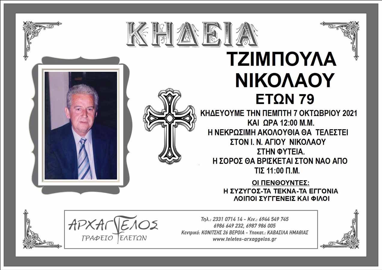 Απεβίωσε σε ηλικία 79 ετών ο Νικόλαος Τζίμπουλας. Η κηδεία θα γίνει την Πέμπτη 7 Οκτωβρίου 2021 στις 12 μ.μ. Η νεκρώσιμη ακολουθία θα τελεστεί στον Ιερό Ναό Αγίου Νικολάου στη Φυτειά.