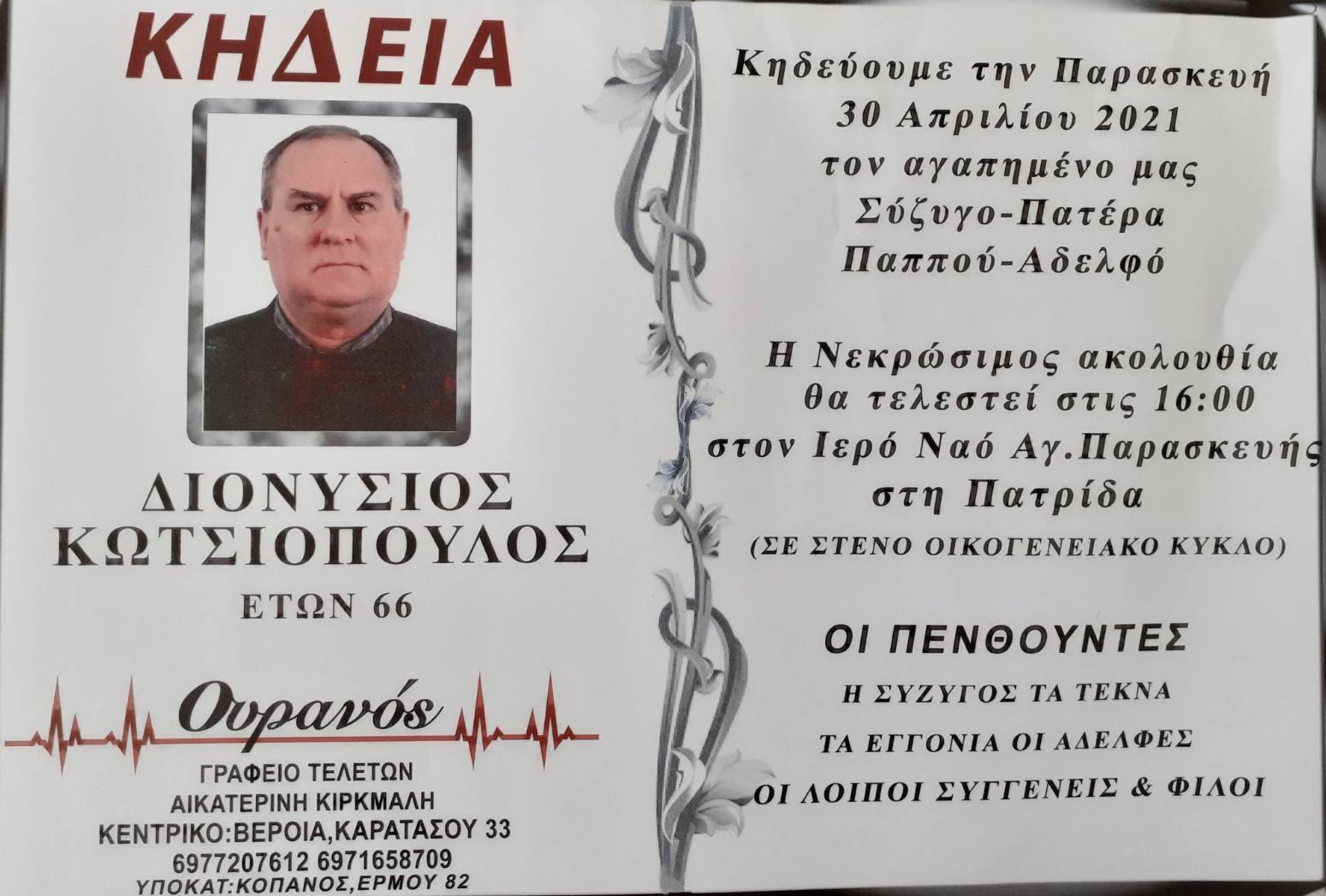 Απεβίωσε σε ηλικία 66 ετών ο Διονύσης Κωτσιόπουλος. Η νεκρώσιμος ακολουθία θα τελεστεί σήμερα, Μ. Παρασκευή στις 16:00 στον Ιερό Ναό Αγίας Παρασκευής στην Πατρίδα, σε κλειστό οικογενειακό κύκλο.