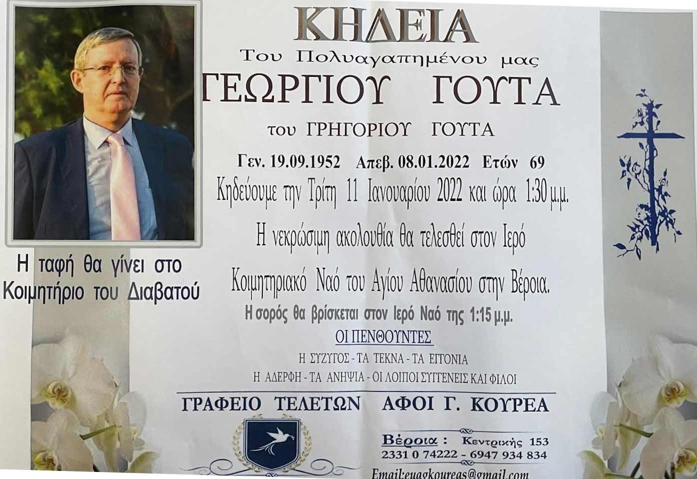 Απεβίωσε σε ηλικία 69 ετών ο Γεώργιος Γούτας. Η κηδεία θα τελεστεί την Τρίτη 11 Ιανουαρίου 2022, στις 13:30, στον Ιερό Ναό Αγίου Αθανασίου Βέροιας. Η ταφή θα γίνει στο Κοιμητήριο του Διαβατού.