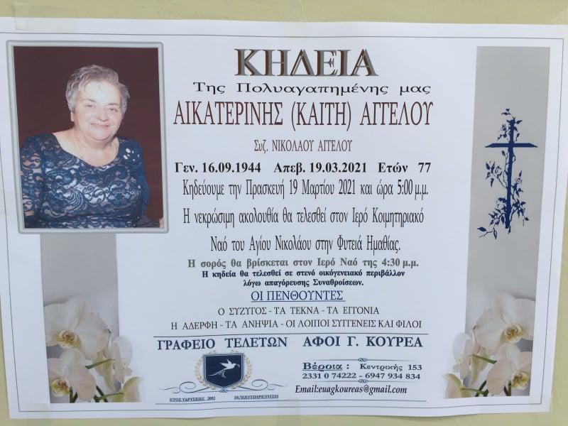 Απεβίωσε σε ηλικία 77 ετών η Αικατερίνη (Καίτη) Αγγέλου, Συζ. Νικολάου Αγγέλου. Η κηδεία της θα γίνει την Παρασκευή 19 Μαρτίου στις 5μμ, στον Ιερό Ναό Αγίου Νικολάου στη Φυτειά Ημαθίας και θα τελεστεί σε κλειστό οικογενειακό κύκλο λόγω της απαγόρευσης συναθροίσεων.