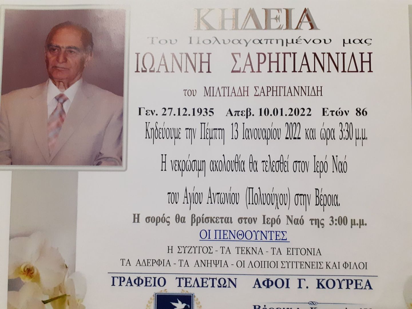Απεβίωσε σε ηλικία 86 ετών ο γιατρός Ιωάννης Σαρηγιαννίδης.  Ο γνωστός παθολόγος, υπηρέτησε επί σειρά ετών το τότε ΙΚΑ, όπου διετέλεσε και διευθυντής.