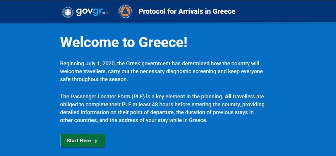 Όλοι οι ταξιδιώτες με προορισμό την Ελλάδα είναι υποχρεωμένοι 48 ώρες πριν το ταξίδι τους να συμπληρώσουν και να υποβάλουν τη φόρμα Passenger Locator Form, η οποία είναι διαθέσιμη στο app Visit Greece και στην ιστοσελίδα travel.gov.gr.