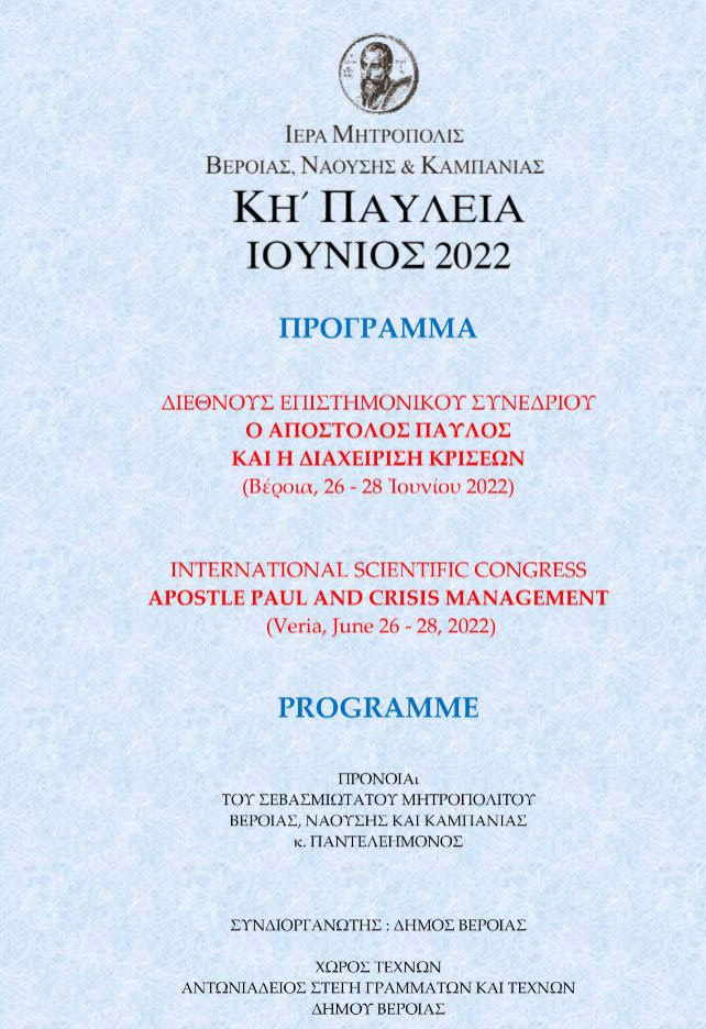 Διεθνές Επιστημονικό Συνέδριο με θέμα: «Ο Απόστολος Παύλος και η διαχείριση των κρίσεων», θα πραγματοποιηθεί στο πλαίσιο των ΚΗ’ Παυλείων, στο Χώρο Τεχνών και στην Αντωνιάδειο Στέγη Γραμμάτων και Τεχνών του Δήμου Βεροίας, το τριήμερο 26, 27 και 28 Ιουνίου.