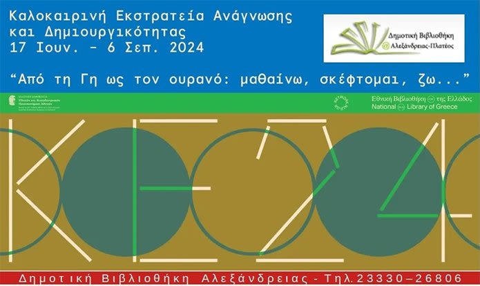 Με σύνθημα “Από τη Γη ως τον ουρανό: μαθαίνω, σκέφτομαι, ζω…” και κεντρικούς άξονες τη γνώση, την επιστήμη, τον πολιτισμό, αλλά και τον ίδιο τον άνθρωπο, αυτό το καλοκαίρι, οι τοπικές βιβλιοθήκες μετατρέπονται σε κυψέλες εξερεύνησης και δημιουργικότητας και μας προσκαλούν, σε μια περιπλάνηση, κάνοντας τον δικό μας γύρο του κόσμου και ξετυλίγοντας το νήμα της ζωής στον πλανήτη.