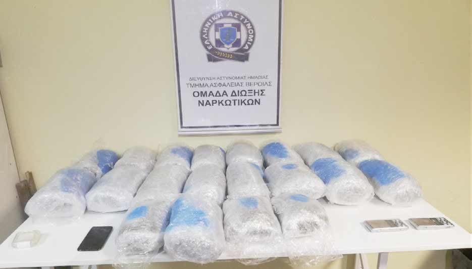 Συνελήφθησαν χθες Παρασκευή 15 Νοεμβρίου, τα ξημερώματα, μετά από συντονισμένες ενέργειες των αστυνομικών της Ομάδας Δίωξης Ναρκωτικών του Τμήματος Ασφάλειας Βέροιας, 37χρονος αλλοδαπός και 40χρονος ημεδαπός, για διακίνηση κάνναβης.Ειδικότερα, εντοπίσθηκε ο 37χρονος σε περιοχή της Θεσσαλονίκης, όπου στην κατοχή του βρέθηκε και κατασχέθηκε ποσότητα κάνναβης βάρους 1 κιλού και 50 γραμμαρίων, καθώς και ένα κινητό τηλέφωνο.Σε έρευνα που ακολούθησε στην οικία του 40χρονου σε περιοχή της Θεσσαλονίκης, που χρησιμοποιούσαν μαζί με τον 37χρονο για την απόκρυψη ναρκωτικών ουσιών (καβάτζα), βρέθηκαν επιπλέον και κατασχέθηκαν: